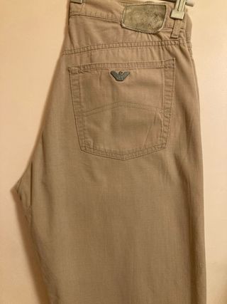 Pantalón original vintage de Armani Jeans en color beige. Un clásico con un diseño atemporal. - Logo de águila característico de la marca. - Etiqueta de cuero en la parte trasera. - Bolsillos traseros con pespuntes.