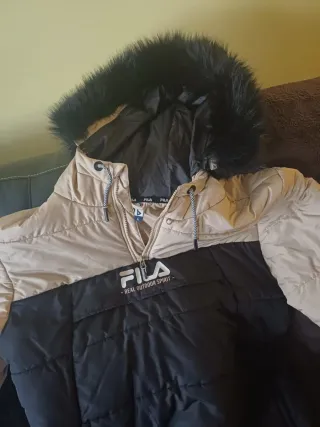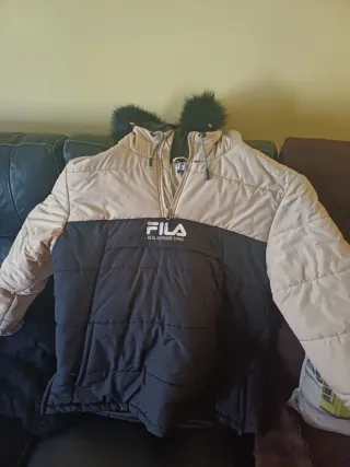 Chaqueta/abrigo juvenil de la marca Fila, con un diseño moderno y cálido.Nueva sin estrenar,sin etiqueta,fue comprada para mí hijo ,me costó 79€,al final se le olvidó en el armario y nunca se lo puso. - Diseño bicolor en beige y negro. - Capucha con detalles de pelo que se puede quitar - Cierre frontal de cremallera. - Logo de Fila en el pecho.