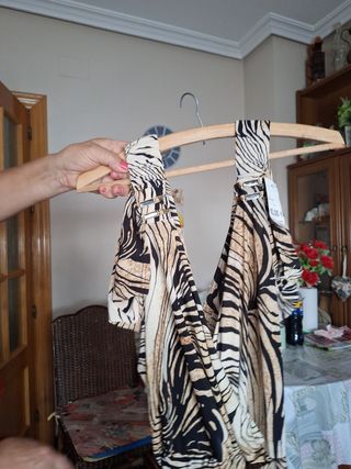 Precioso vestido de estampado cebra en tonos beige y negro. Es nuevo, con etiqueta. - Diseño favorecedor. - Escote pronunciado. - Sin mangas. - Cierre con hebillas doradas.
