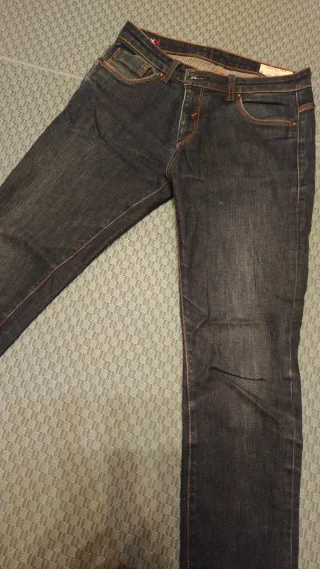 Vaqueros de corte moderno en tono negro lavado. Cuentan con un diseño clásico y versátil. - Etiqueta de cuero en la parte trasera. - Bolsillos traseros con detalle. - Costuras reforzadas. -loa detalles gastados son así no es que esté estropeado