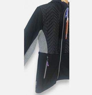 Perfecta para actividades al aire libre o para el día a día cuando refresca. Talla 42 / L (EUR 3), equivalente aprox. a una L europea de mujer. Con diseño deportivo y femenino, combina panel frontal acolchado en forma de chevrón con tejido softshell elástico en mangas y espalda, ofreciendo libertad de movimiento y buen aislamiento. Incorpora capucha fija, cierre central con cremallera completa y dos bolsillos laterales con cremallera para guardar las manos u objetos pequeños con seguridad. Detalles en contraste en las cremalleras y laterales que le dan un toque moderno. totalmente nueva, con etiquetas originales.