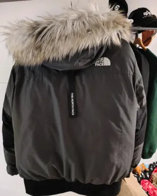 Chaqueta The North Face de color negro, con capucha y detalles de pelo sintético. - Cierre frontal con cremallera y botones. - Bolsillos laterales con cremallera. - Bolsillo adicional en la manga con cremallera y etiqueta. - Puños y cintura elásticos.
