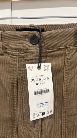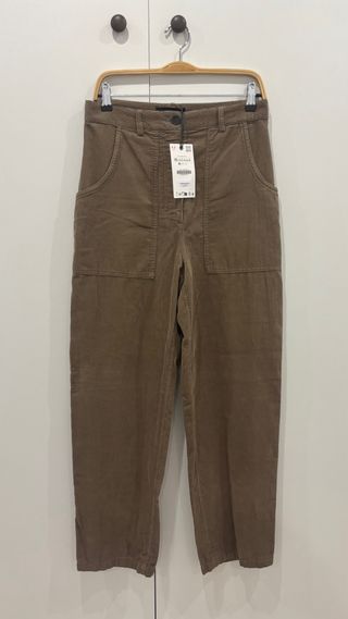 Pantalón recto de pana de Zara en color marrón topo. Tiro medio, cintura con trabillas y bolsillos. Es una XS pero talla grande. Nuevo a estrenar con etiqueta, ref. 4043/265/737
