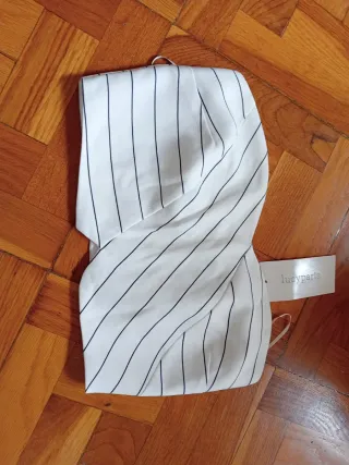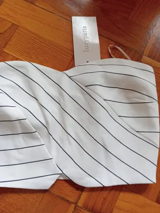Top de la marca Lucy Paris con un diseño de rayas verticales en blanco y negro. Aún conserva su etiqueta original. Talla USA XS, EUR 36.. Mide 37x22cm. - Diseño de rayas. - Con etiqueta.