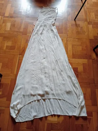 Vestido largo de color beige, ideal para cualquier ocasión. Aún conserva su etiqueta original. La medida entre las sisas es de 34cm. Tirantes regulables con atado cruzado a la espalda. Largo delantero 105cm desde el corte del talle. Más largo por detrás, 125cm. Forrado. - Diseño elegante y fluido. - Tejido ligero y cómodo.
