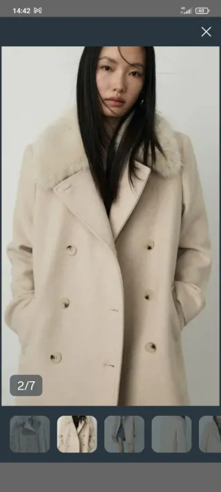 Abrigo de paño sin estrenar con etiqueta de color beige, con cuello de pelo que se puede quitar y poner. - Lana 18% - Diseño de doble botonadura. - Bolsillos frontales. - Forro interior. - Precio no negociable