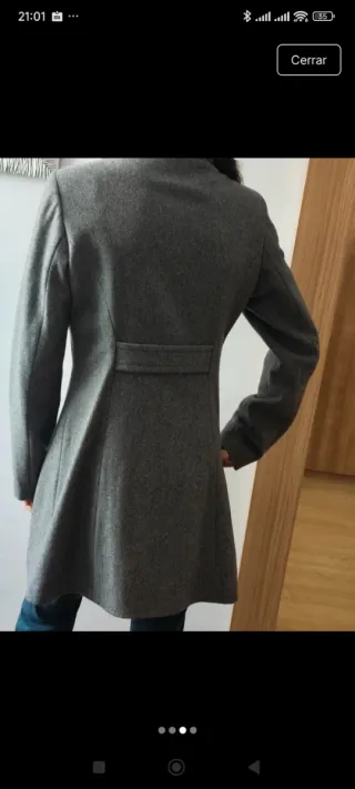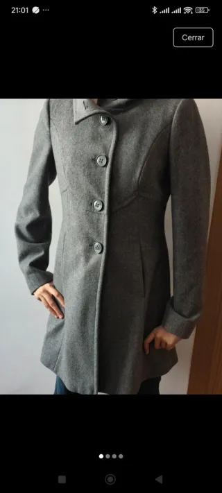 Elegante abrigo de la marca Benetton. - Color gris. - Diseño clásico. - Cierre de botones. Abrigo gris de paño. Con forro interior. Es ajustado. Puesto muy poco. Impecable. En la etiqueta indic talla 40 pero en es 38. Da poca talla para una 36 quizás mejor.