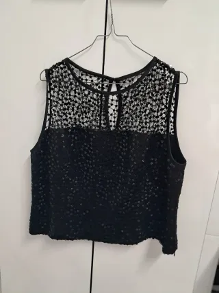 Elegante top de fiesta con un diseño sofisticado. - Parte superior de encaje con detalles. - Cuerpo adornado con lentejuelas. - Diseño sin mangas. - Abertura en la espalda.