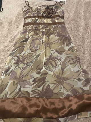 Vestido de fiesta de tres piezas. Talla XXL puede equivaler a una talla 46-48 falda,para una estatura de 1'70cm aproximadamente y pecho entre una 90-95 - Color marrón. - Tejido satinado.