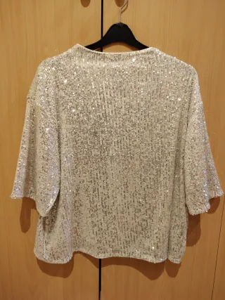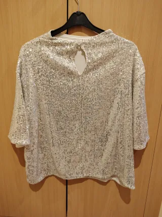 Camiseta de fiesta con un diseño brillante y elegante. Usada en un par de ocasiones. - Cubierta de lentejuelas plateadas. - Manga corta. - Corte holgado.