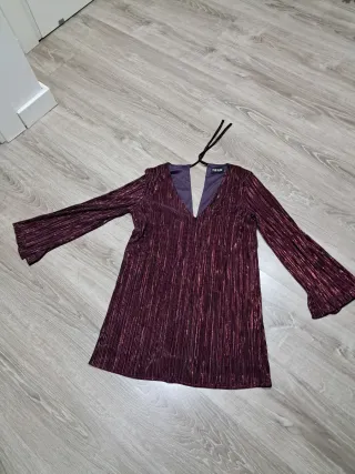 Vestido mini de fiesta con un diseño brillante y elegante. Burdeos Perfecto para ocasiones especiales. El forro es pantalo . - Tejido con acabado metalizado. - Mangas acampanadas. - Escote pronunciado en V.