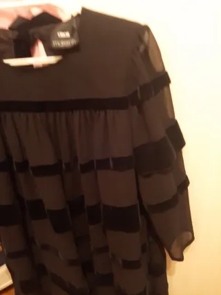 Vestido de fiesta elegante en color negro. Ideal para ocasiones especiales. - Diseño con volantes en las mangas y cuerpo. - Tejido semitransparente con detalles de terciopelo. - Cierre en la espalda con lazada.