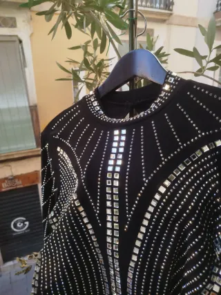 Top negro con pedrería en escote. Tejido elástico. Bajo fruncido. Talla S ( da para 38 ). Medidas : Entre axilas 36 cm , largo 66 cm. Nuevo..