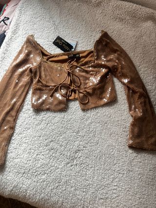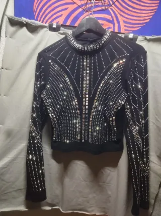 Elegante blusa de fiesta con un diseño brillante y llamativo. Ideal para ocasiones especiales. - Mangas largas. - Tejido con acabado metalizado. - Corte crop.