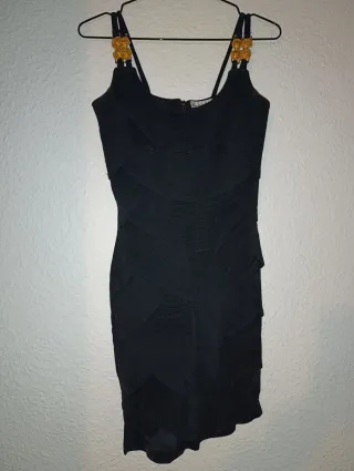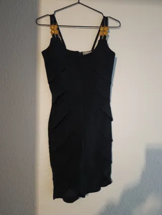 Elegante vestido negro con detalles únicos. No indica talla en el vestido pero debe ser la talla S-36 - Tirantes con adornos dorados. - Diseño con capas. - Cremallera en la espalda. Ideal para las noches de fiesta!