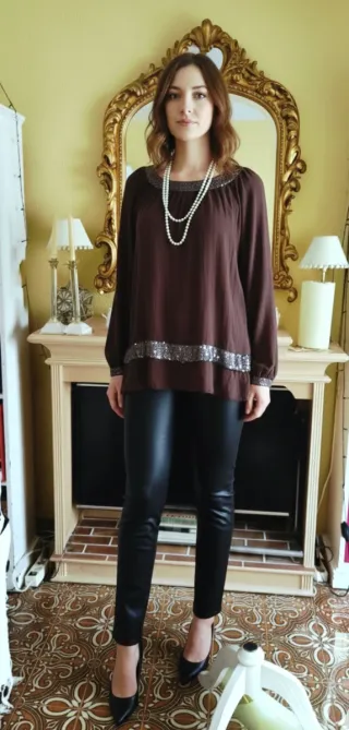 Elegante blusa larga tipo túnica en color marrón chocolate. Es una prenda hecha en Italia con un tejido muy ligero, fluido y con una caída preciosa. Lo más especial son los detalles de lentejuelas en el escote y en el bajo, que le dan un toque de brillo ideal para eventos, cenas o fiestas. Las mangas son semi-transparentes y el corte es holgado, muy cómodo y favorecedor. Cómo combinarla: Queda perfecta con pantalones de vestir oscuros y tacones para un look formal. También puedes usarla con leggings ajustados o vaqueros pitillo para un estilo más informal pero sofisticado.