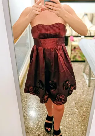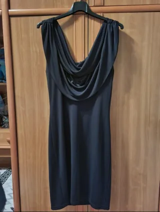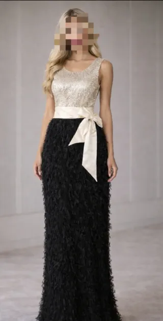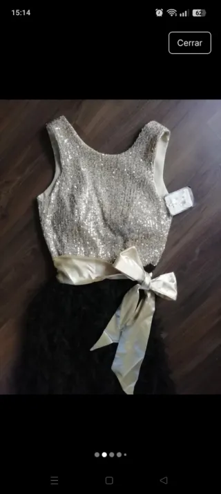 - Precioso vestido de fiesta. - El faldón es color negro y lleva una tela con pequeños flecos/tiras que asemejan unas plumas. - La parte superior es plateada/brillante. - El escote en la espalda es redondo. - Tiene cremallera - Lleva un listón removible que puedes poner a tu gusto. - Está nuevo y el precio original fueron 180€ - Nota: Mido 1.73cm y llevo tacones de 10 cm