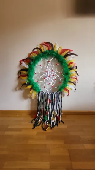 Atrapasueños o accesorio de carnaval. - Medidas : diametro 95 cm. Alto total 140 cm. - Decorado con plumas de varios colores y un borde verde. - Cuelgan tiras de tela en blanco, negro y otros colores. - Se puede colgar en pared o poner con las varas de apoyo en el suelo - Ideal como decoración o para disfraces. - DISPONIBLES 3 UNIDADES - PRECIO UNIDAD : 12 € - PRECIO LOTE 3 UNIDADES : 27 €