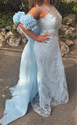 Elegante vestido de fiesta con detalles intrincados. - Diseño con escote ilusión y pedrería plateada. - Mangas abullonadas con volantes. - Falda larga y ajustada con pedrería. - Cierre de cremallera en la espalda. - La cola se puede quitar - Talla S/M - Hecho por impulso modas granada - Puesto una vez