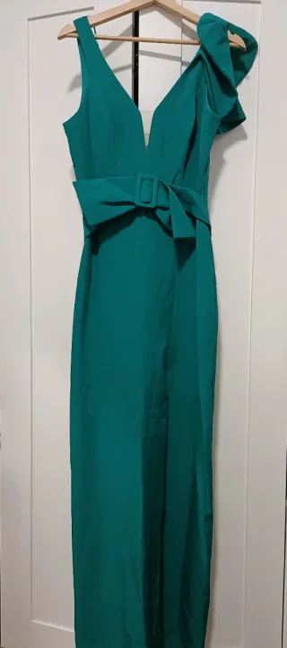 Elegante vestido de fiesta largo en un llamativo tono verde azulado. Diseñado para ocasiones especiales, este vestido presenta un detalle de cinturón con hebilla que realza la silueta. - Escote pronunciado en V. - Detalle de volante en un hombro. - Cinturón de tela con hebilla cuadrada. - Abertura lateral en la falda.