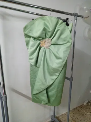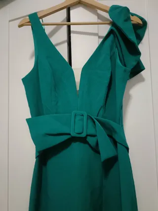 Elegante vestido de fiesta largo usado prácticamente nuevo. Me costó 100 euros. - Diseño halter. - Cuerpo superior con detalles plateados. - Cinturón negro. - Falda larga en color verde.