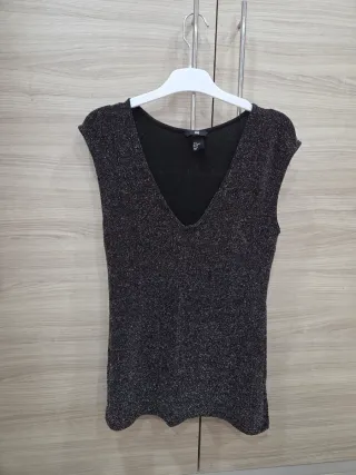 Camiseta de tirantes con un tejido brillante en tonos plateados y negros, ideal para ocasiones especiales. - Diseño con escote en V. - Tejido elástico y cómodo. Talla M más bien