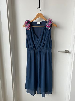 Vestido de fiesta para premamá con un diseño elegante. Incluye apliques de flores en los hombros que puedes quitar si quieres. De la marca francesa mamalicious. - Escote en V cruzado. - Adornos florales en los hombros. - Cintura elástica. - Falda con caída fluida. Recogida Metro Bac de Roda. También hago envíos