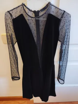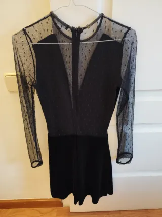 Vestido corto de fiesta con un diseño elegante. - Talla S, Zara. Tejido principal de terciopelo. - Espalda y mangas largas de plumeti con transparencia. - Escote pronunciado en V. - Cuello desgastado.