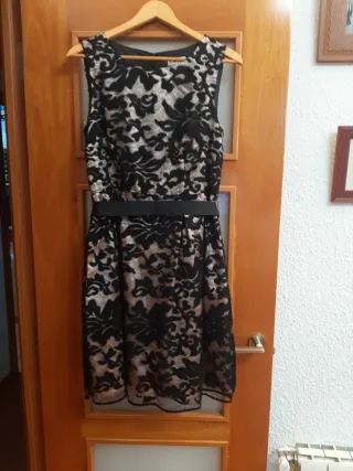 Elegante vestido de fiesta con un delicado encaje. - Diseño sin mangas. - Detalle de volantes en la falda. - Acabado con puntilla en el bajo.
