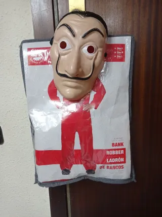 Disfraz inspirado en la popular serie La Casa de Papel. Talla S Incluye máscara y mono. Buen estado,va en su funda pero ésta está un poco deteriodara