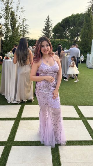 Falda de lentejuelas, la parte de arriba es de gasa con forro interior. Es una talla 42 elástica, podría utilizarse para una 44. Las medidas son : - Axila a axila: 50 cm, estira hasta 60. - Cintura: 42 cm, estira hasta 46. - Cadera: 50 cm, estira hasta 60. - Largo: 85 cm.