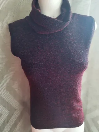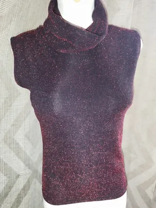 Sin mangas, cuello alto. Tejido elástico con lurex. Perfecto estado. Es talla única, pero no se podría utilizar para más de una 46. Las medidas son: - Axila a axila: 44 cm, estira hasta 55 - Cintura: 36 cm, estira hasta 46 - Cadera: 39 cm, estira hasta 50 - Largo desde el hombro: 56 cm