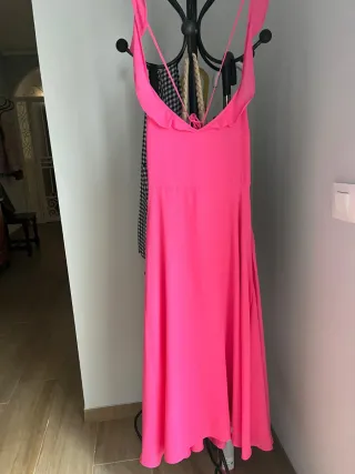 Vestido de fiesta en color rosa, comprado en El Corte Inglés. Ajustable por la espalda, con cremallera invisible y doble forro. - Diseño con volantes en el escote. - Tirantes finos. - Falda con vuelo.
