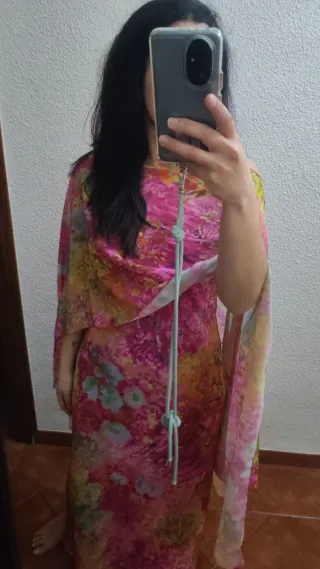 Vestido de fiesta con un vibrante estampado floral. Su diseño es elegante y llamativo. De feversave (modelo Magnolia) Sin estrenar Me lo puse para la foto y tiene su caja - Diseño con escote. - Tejido ligero y fluido.