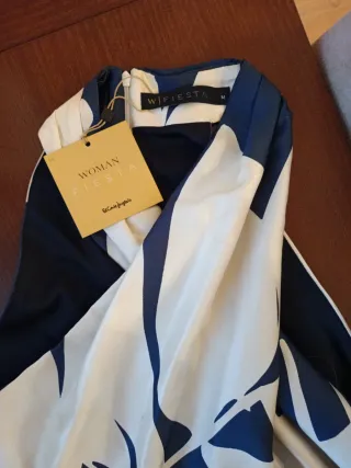 Precioso vestido de fiesta con un diseño llamativo y elegante. Sin mangas, cruzado al cuello y con mucha caída. - Estampado de hojas en tonos azul y blanco. - Corte asimétrico. - Cinturón ancho a juego de la misma tela del vestido. Ideal para cualquier ocasión especial: cóctel, comunión, boda, cena... Está sin estrenar, con la etiqueta porque lo compré para una boda y al final voy a llevar otro.