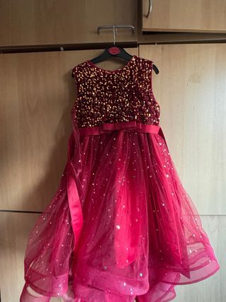 Vestido de fiesta color vino burdeos con detalles brillantes, para una comunión, una ocasión especial, la fiesta de los 15 de una amiga o familiar. Talla 140 - Cuerpo superior adornado con lentejuelas doradas. - Falda de tul con estrellas y lunas plateadas. - Cintura marcada con un lazo. - Diseño sin mangas. - cremallera en la espalda. UTILIZADO EN UNA OCASION- festival de teatro en SOM escuela de musicales.