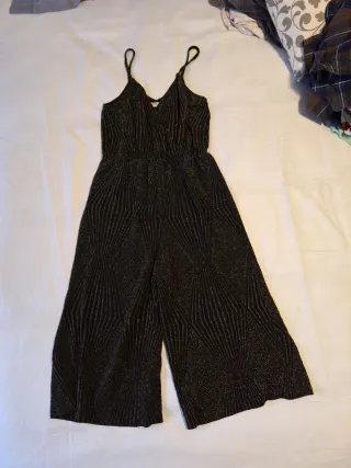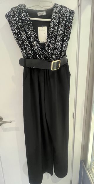 Elegante mono de fiesta con top de lentejuelas plateadas y negras. La parte inferior es de pantalón largo negro y viene con un cinturón a juego. - Diseño con escote pronunciado. - Manga corta. - Cinturón negro con hebilla dorada. - prenda versátil para cualquier fondo de armario para eventos. - Elegante al máximo es una talla S pero da desde una 34 a una 40 tranquilamente. En los hombros, lleva un poquito de almohadilla que ayuda a que quede perfecto y no quede caído . Precio no negociable