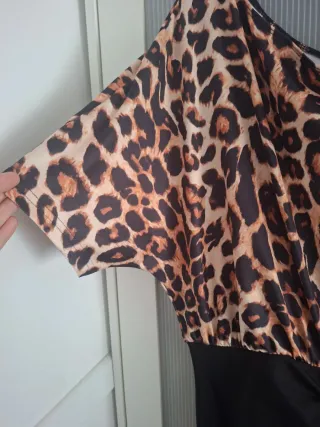 Vestido de fiesta con estampado de leopardo y falda negra. Corte asimétrico en cuello y mangas de leopardo, con frontal fruncido de cintura hasta el bajo y con apertura en la parte baja trasesa