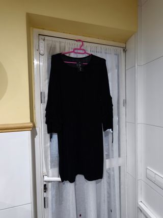 Vestido de fiesta negro brillante con escote cruzado y drapeado, tiene un tejido elástico y favorecedor 🖤✨️ - Mangas 3/4. - Corte cruzado. - Cinturón a juego. Talla: única 📏 Recomendable para M-L. Nuevo, un solo uso ✅️ 📦 Envíos rápidos. 🤝🏻 Entrega en mano en Madrid.