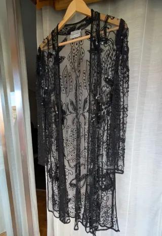 Elegante chaqueta larga de tul con intrincados bordados y azabaches. Una pieza de alta costura, llamativa y sofisticada, fabricada en Inglaterra por el conocido diseñador Frank Usher. - Diseño de tul transparente. - Adornos de azabache y pedrería. - Estampado floral y paisley. - Nunca se ha usado - El azabache es una gema semipreciosa y se considera amuleto de la suerte, protege de las envidias y del mal de ojo, aporta sensación de bienestar y felicidad, elimina los dolores, alivia las preocupauciones, ayuda en la toma de decisiones y nos conecta con la energía de la tierra