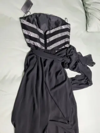 Elegante vestido largo para eventos especiales. CON ETIQUETA FIRMA ARIELLA. Precio inicial 130€ - Diseño sin tirantes. - Cuerpo superior con detalles de lentejuelas plateadas. - Cintura marcada con un lazo de tela. - Falda larga y fluida en color negro.