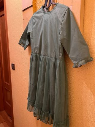 Precioso vestido de fiesta o ceremonia en un bonito tono verde agua. Talla 14,aunque no da mucha talla el ancho de la espalda. (Me di cuenta demasiado tarde. Por eso no lo pude descambiar) - Diseño con falda de tul. - Mangas tres cuartos con detalle. - Cuello con volante. No es posible rebajarlo