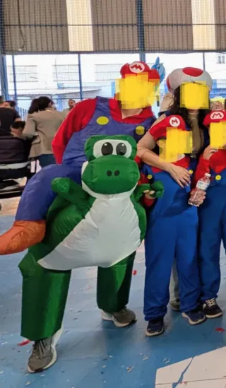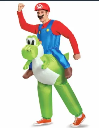 Disfraz hinchable de Mario Bros montado en Yoshi. Ideal para fiestas y eventos. - Incluye disfraz hinchable de Yoshi. - Talla única para adultos. - En perfecto estado