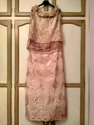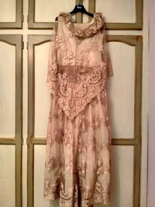 Elegante vestido largo de Fely Campo, con un delicado diseño en tonos nude. Incluye la capelina a juego. - Tejido con encaje floral. - Capelina de encaje con cuello semibarco. - Cintura marcada con cinturón drapeado. - Bajo con puntilla de encaje. Se regala tocado y cartera a juego.