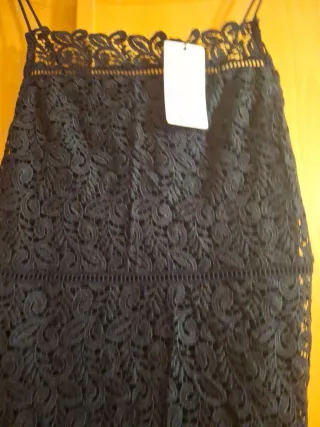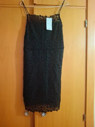 Vestido de fiesta de encaje negro de Mango. Ideal para eventos especiales. - Diseño de tirantes finos. - Detalle de encaje en el escote y bajo. Y todo el vestido es de encaje. Medidas: desde el tirante 85 cm Sisa 41 cmt. Cintura 39. Es algo elástico. Queda entallado..perfecto para una 38.