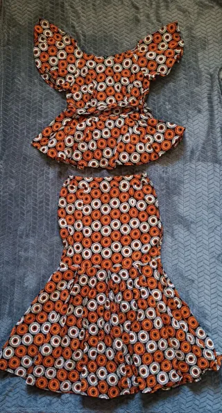 Conjunto de dos piezas con un llamativo estampado circular. - Estilo Ankara - Diseño con volantes en la parte superior. - Falda con vuelo en la parte inferior.