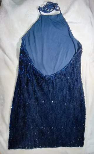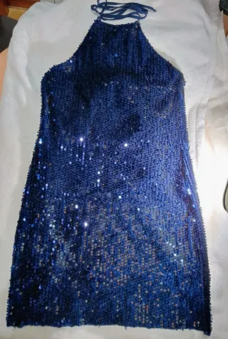 Vestido de fiesta de lentejuelas, mini, cuello anudado tipo halter, espalda descubierta, puesto solo una vez para una celebración especial, se vende por cambio de talla.