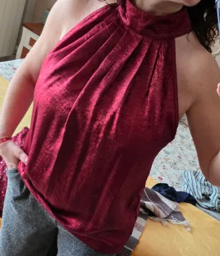 Elegante camiseta de fiesta con un vibrante color rojo. Su diseño drapeado en el cuello añade un toque sofisticado. - Tejido con brillo satinado. - Cuello halter con pliegues. - Espalda descubierta.