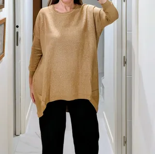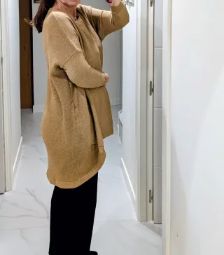 Elegante jersey largo en tono dorado, con un acabado brillante que lo hace perfecto para ocasiones especiales. - Diseño holgado y cómodo. - Tejido con hilos metalizados. Es asimétrico, más largo por detrás. Usado un par de veces. 68 cm de largo por delante. 88 cm por detrás.
