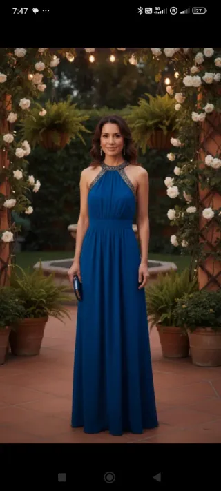 Elegante vestido largo, ideal para eventos y celebraciones. - Diseño con escote halter. - Detalle de drapeado en el corpiño. - Falda fluida y larga. Puesto en una ocasion